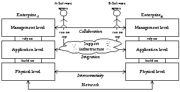 Setting up an infrastructure for enterprise application integration requires working at three different levels. The first level, called interconnectivity, allows simple data transfer with no semantic. The second level, called integration, involves the various applications and enables these application to exchange information and invoke mutually their services, even if different persons designed these applications at different times with different techniques. Working at the application level is not enough, particularly if the enterprises have to merge as well as to expand their business processes. Therefore, collaboration at the management level is required. In what follows, the three levels are summarised[2] (cf. Figure 1):