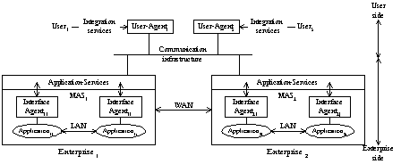 Figure 2 illustrates the infrastructure architecture we suggested for enterprise application integration. This architecture can be viewed from two different sides: enterprise side and user side. Moreover, this architecture integrates two types of SAs, namely user-agent and interface-agent. Among these SAs, certain are enhanced with mobility mechanisms. User-agents belong to the user side and interface-agents belong to the enterprise side. In the infrastructure architecture, each enterprise is encapsulated into a Multi-Agent System[3] (MAS) that maintains its autonomy. Each MAS integrates several interface-agents that are respectively associated with the enterprise applications. Two services exist in the infrastructure architecture: application-services offered by interface-agents and integration-services offered by user-agents.