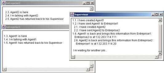 In our work, we have developed five agents, namely supervisor, agent1, agent2, agt-enterprise1, and agt-enterprise2. Supervisor, agent1, and agent2 inherit from the wrapper class while agt-enterprise1 and agt-enterprise2 inherit from the mediation class. The supervisor supervises both agent1 and agent2 and asks them to get information from agt-enterprise1 and agt-enterprise2. In what follows, we focus our description on agent1. The same description applies to agent2. First of all, the supervisor creates agent1 (message 1.1: I have created agent1) and sends it to enterprise1. As soon as agent1 arrives to enterprise1, it interacts with agt-enterprise1 that acts on behalf of this enterprise (message 1.4: I am talking with agent1). Finally, agent1 returns back to the host of its supervisor with appropriate information (message 1.5: agent1 has returned back to its supervisor; message 1.6: agent1 is back and brings this information from enterprise1: enterprise1 is at 132.203.114.20). The purpose of the current prototype is to demonstrate the feasibility of our approach for enterprise application integration. More work needs to be done, for instance by enhancing agents with WF systems.