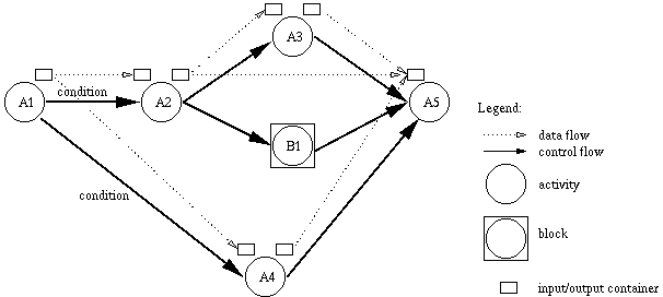 Figure 1 shows a model of a business process which is used in IBM's workflow system 'FlowMark' [IBM94]. Activities are connected via control flow connectors. After finishing Activity A1 Activity A2 is sequentially executed. A3 and B1 will be executed in parallel. Determined by the transition condition belonging to each control connector either the lower branch with A4 or the upper branch is executed. After finished the branch A5 is executed. Each activity has an input and an outputcontainer used for input and outdata. The transport of data is symbolised by the dataflow connectors.