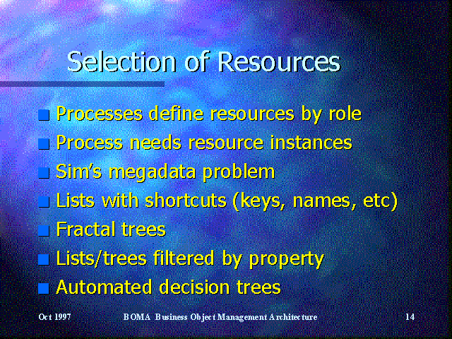 A number of strategies are used to select resource instances for process instances, ranging from manual selection from a list or tree, to fully automated selection based on process specific criteria.
