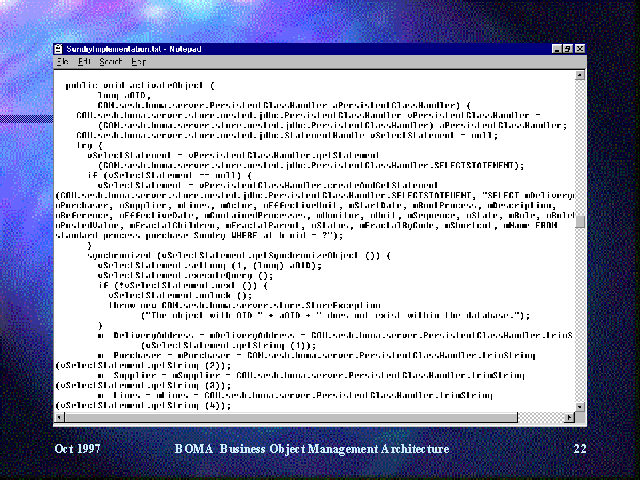 Automatic generation of this code ensures a disciplined object to database interface, particularly in open distributed environments.