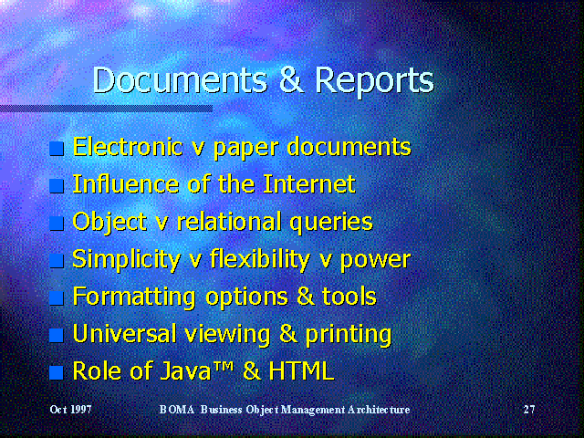 This concept can be used to link static document and report templates to dynamic object attributes and methods, which is easier to use than relational query techniques.