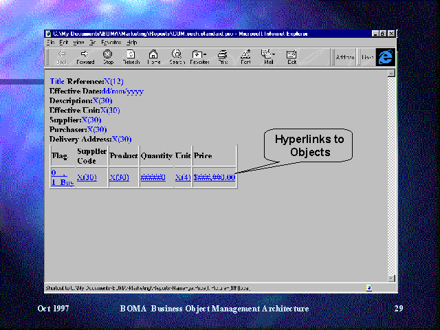 Note that the hyperlinks represent dynamic queries to object attributes and methods, and include picture formatting information.
